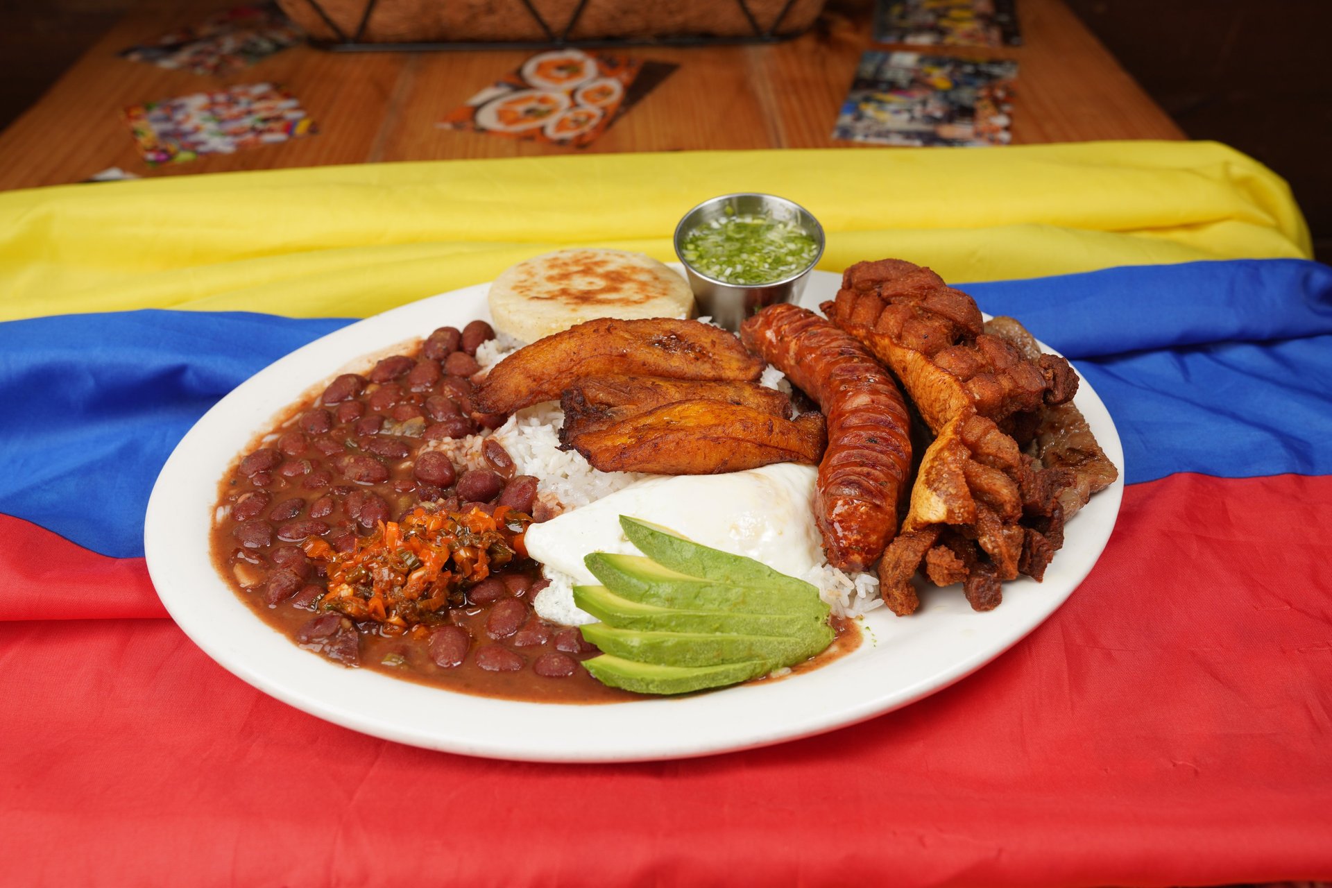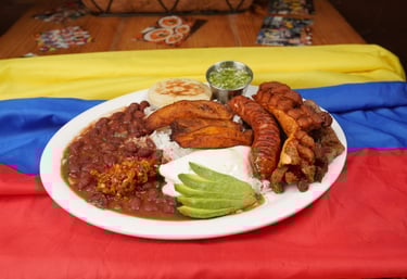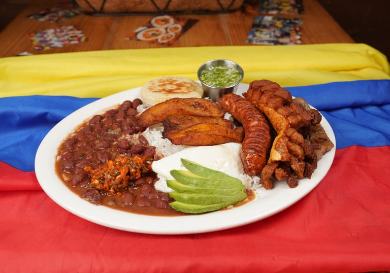 A traditional feast: beans, rice, beef, egg, plantain, and arepa all on one plate. Taste the true flavor of Colombia today!